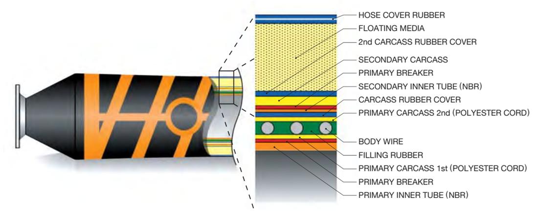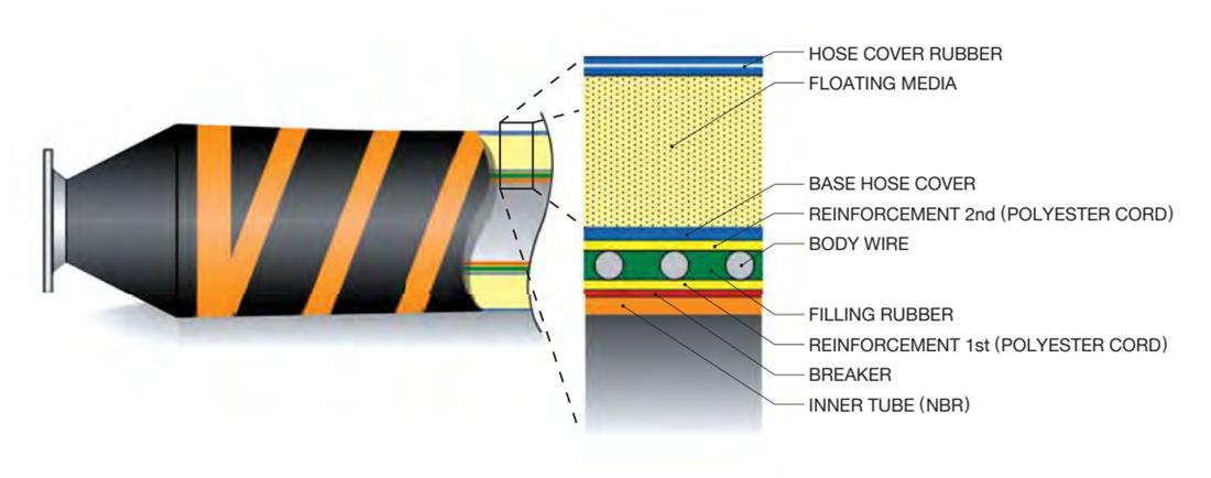 Esta mangueira possui uma camada de reforço adicional em uma extremidade. Sua estrutura está em algum lugar entre mangueiras flutuantes e submersas. É normalmente usado como uma transição entre uma mangueira de linha principal totalmente flutuante e uma mangueira submersa.